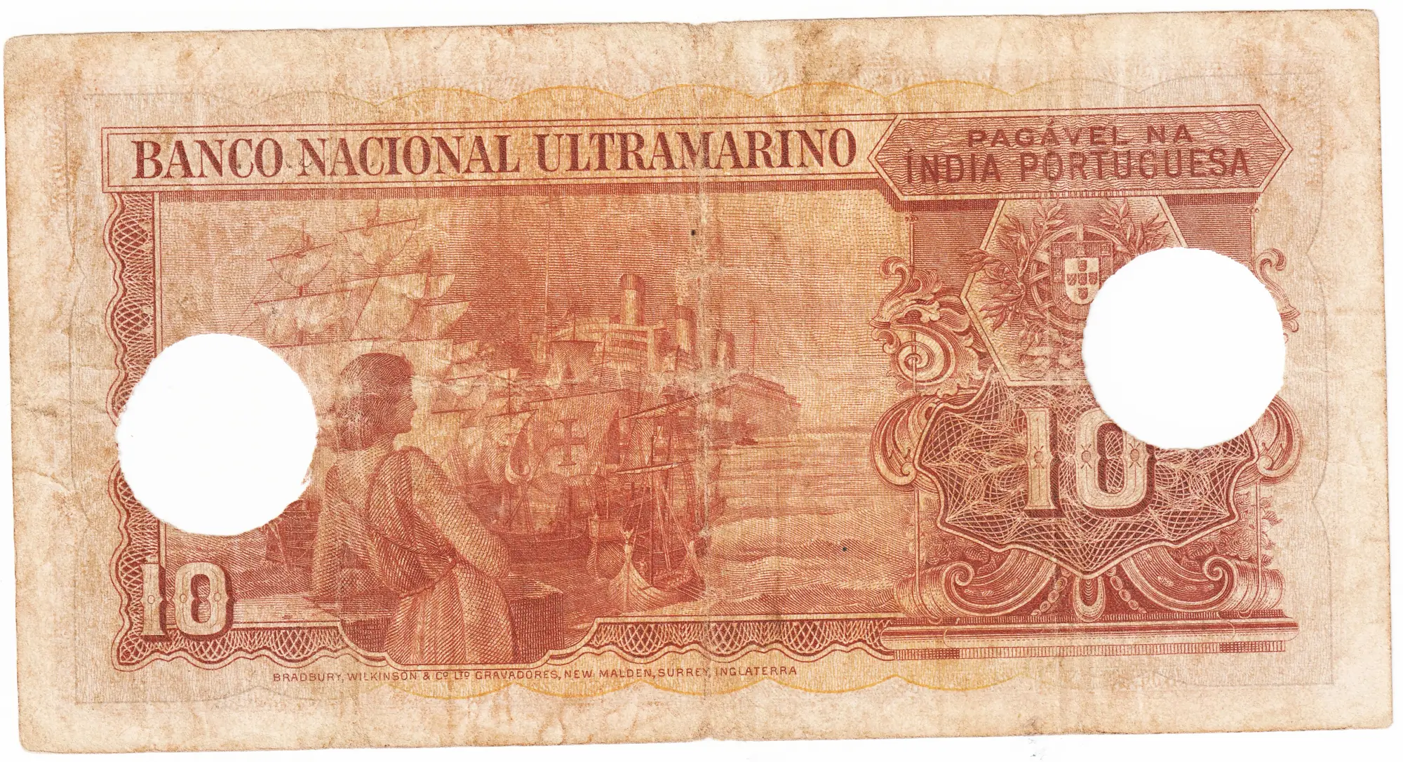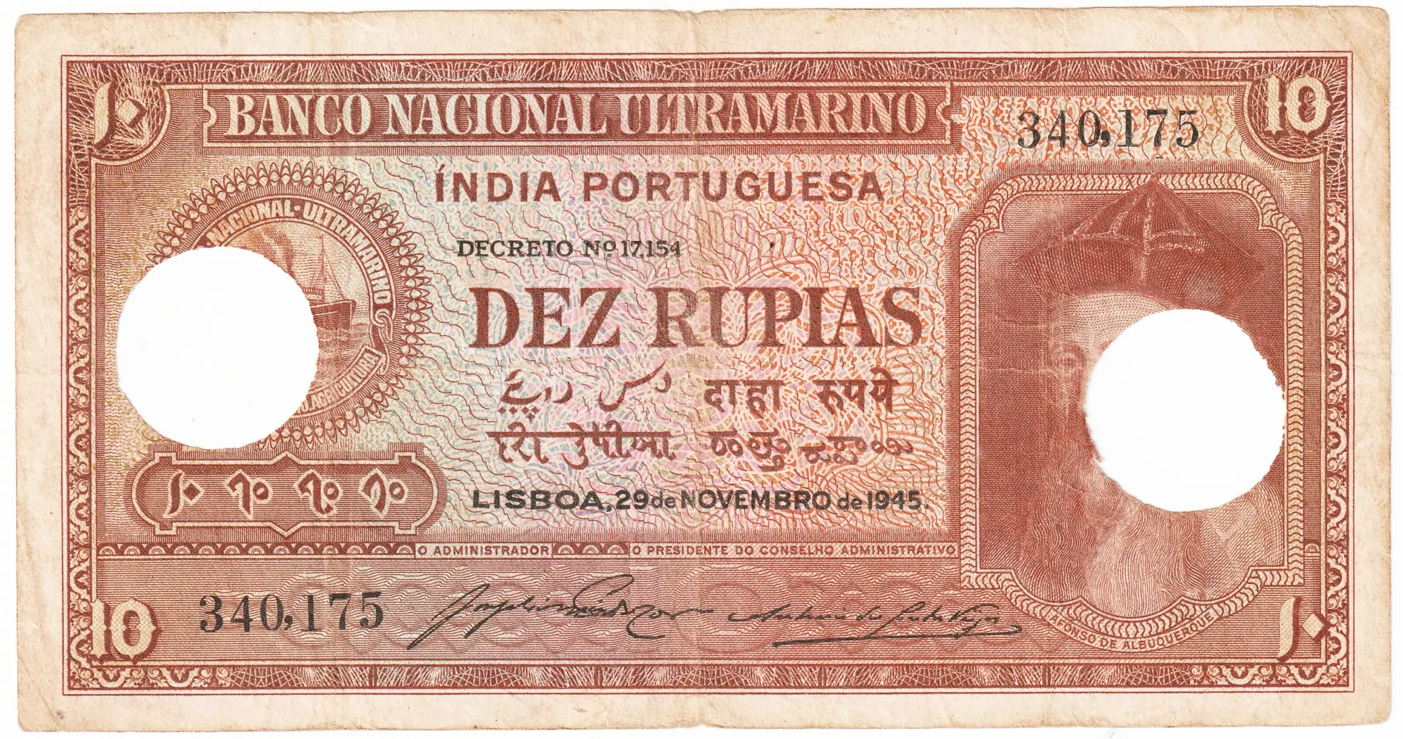 India Portuguesa Dez Rupias – 10 Rupees Dated 29 November 1945 Fine Grade – Cancelled Note
